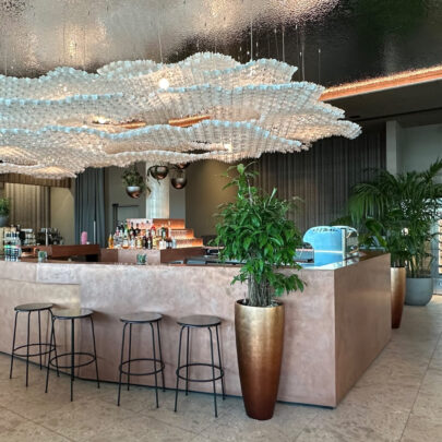 „Die Decken wirkt durch das Zusammenspiel der Materialoberfläche und der Lichtinstallationen wie aus einer anderen Welt. Dynamik und Eleganz werden vermittelt und schaffen eine außergewöhnliche räumliche Atmosphäre. In Kombination mit der Barfront in Kupferoptik, wird die Bar zu einem echten Hingucker.“